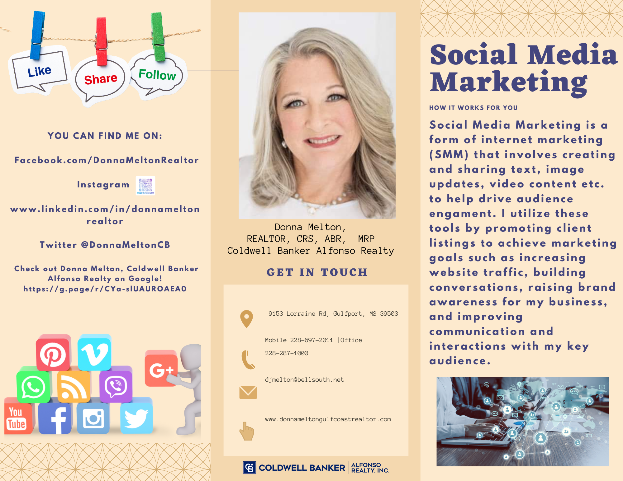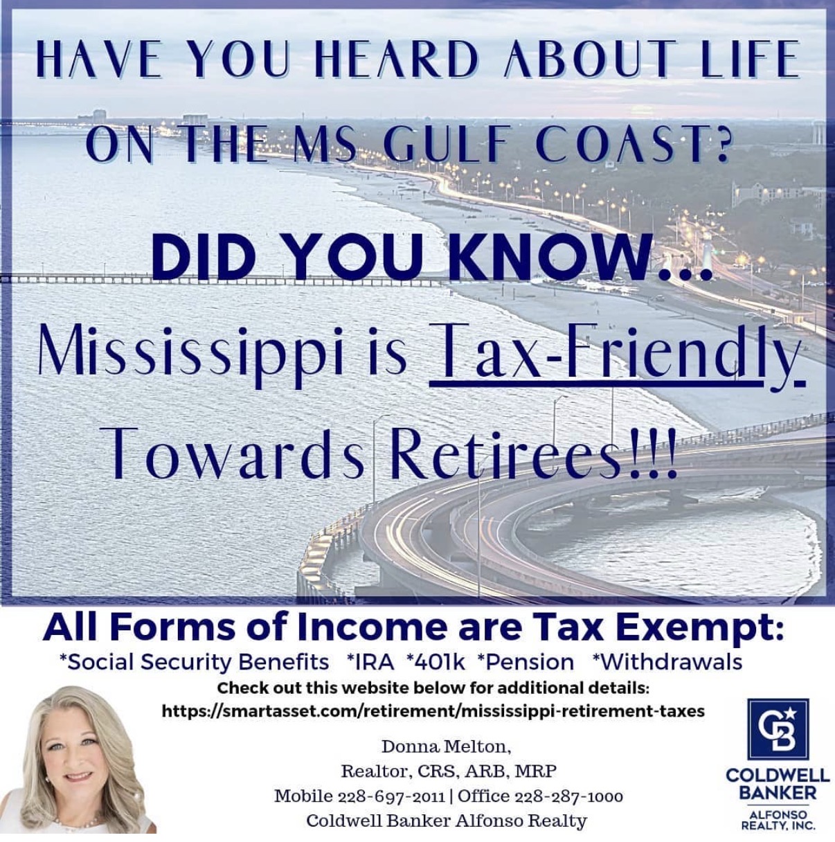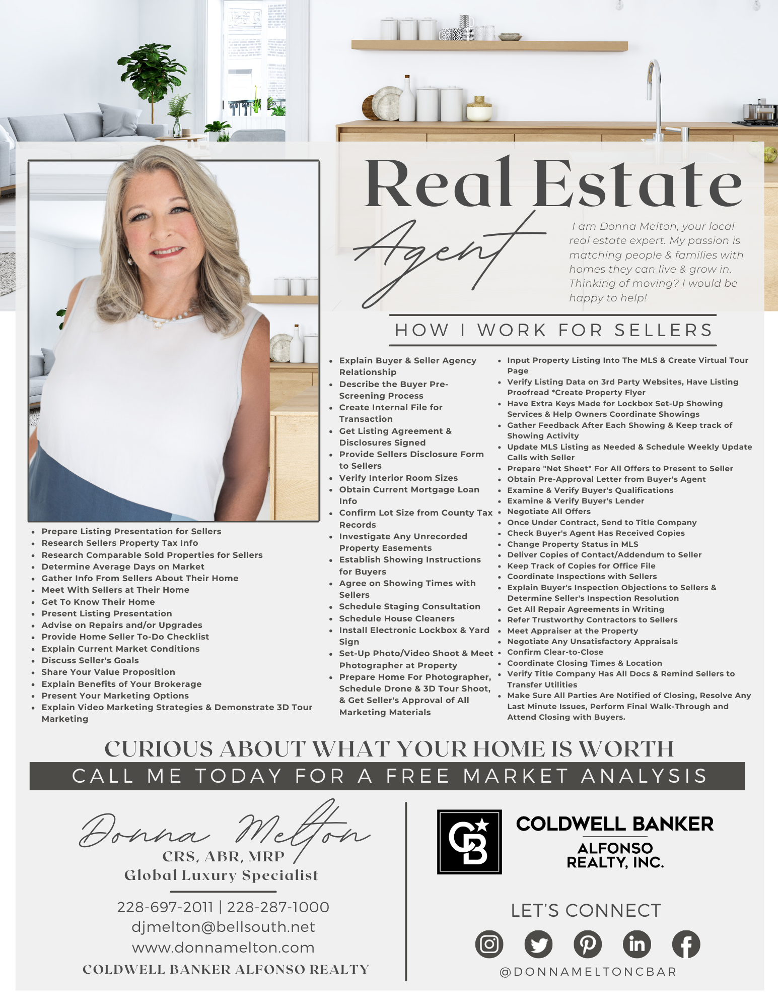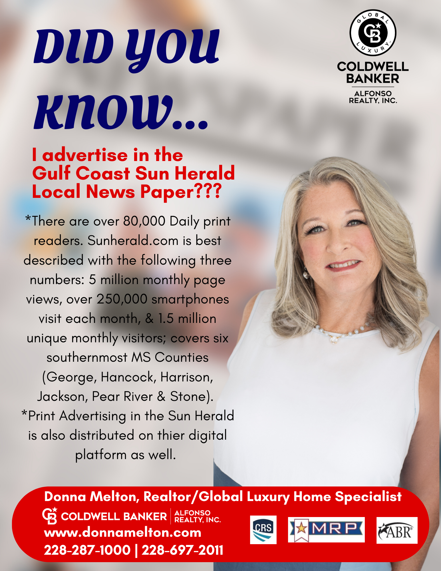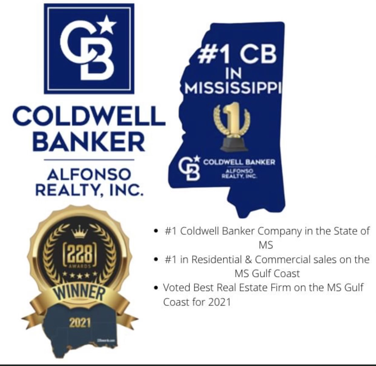 After settling on the MS Gulf Coast in 1976, I knew instantly that I was ‘HOME’, and in 2003 I joined the Coldwell Banker Alfonso Realty Family as a real estate agent. Since then, I’ve had the pleasure of sharing my love for South Mississippi, all the while helping guide families, whether lifetime locals or military service members, to their place they can call home. As a Certified Military Relocation Professional (MRP), Certified Residential Specialist (CRS), and an Accredited Buyer Representative (ABR) I am qualified, with the knowledge and ability to help you buy or sell your home anywhere in the world.