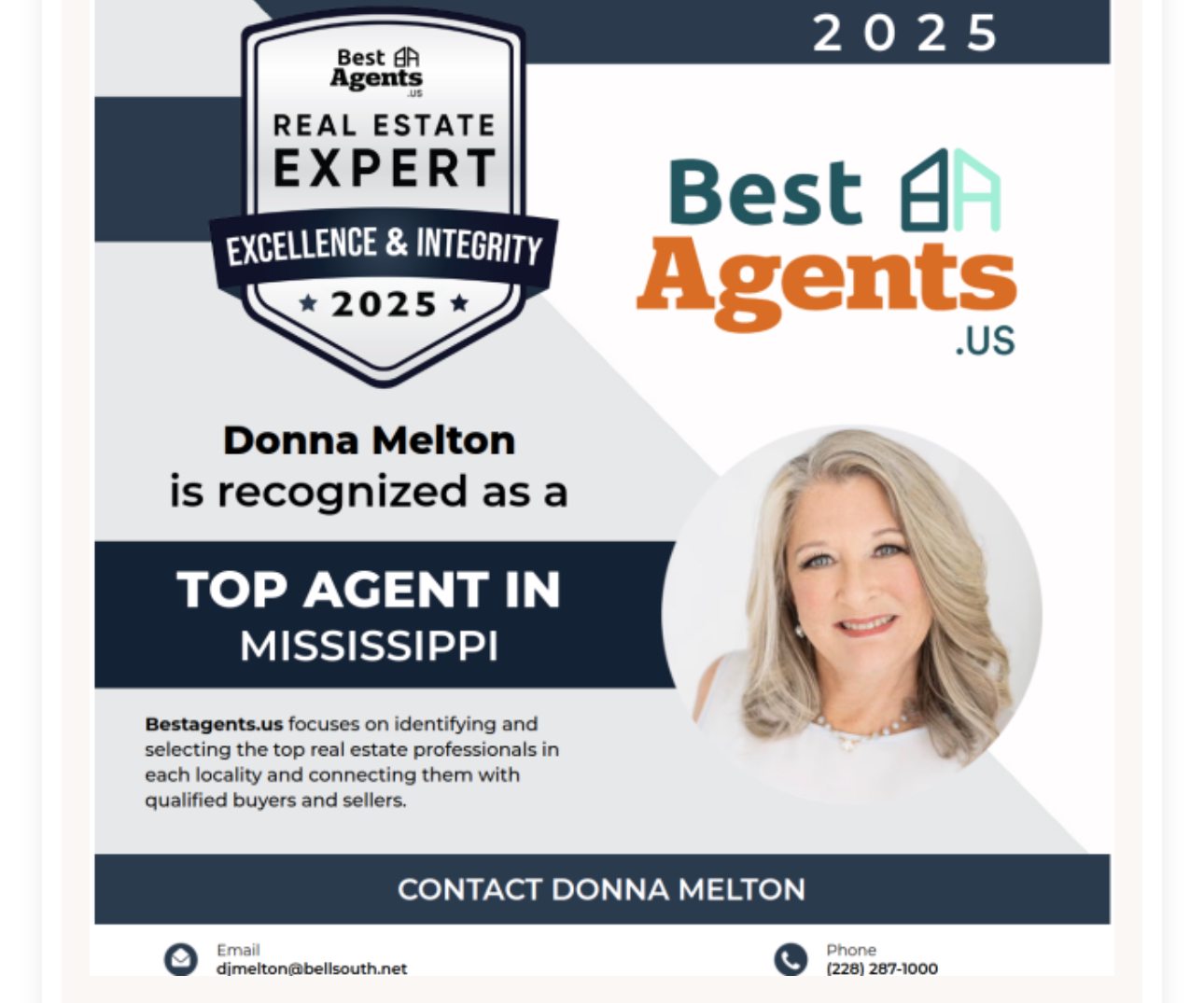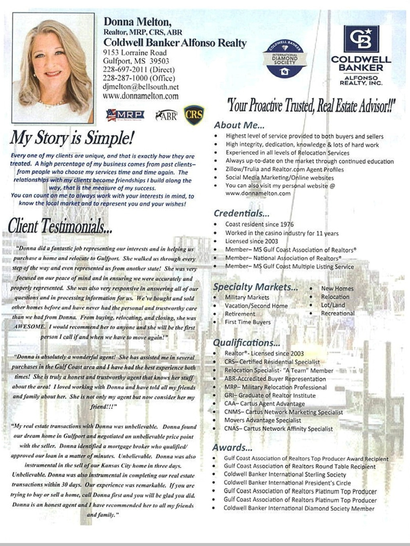 I began my real estate Career with Coldwell Banker Alfonso Realty and because of the family-oriented culture of the office, I have stayed with the same broker and company ever since. During my years in the business I have received from Coldwell Banker National, from the local Association of Realtors and from the National Association of Realtors, Gulf Coast Association of Realtors Top Producer Awards, Round Table Recipient Awards and Platinum Top Producer Awards. I have also received numerous prestigious Coldwell Banker awards including President’s Circle and Sterling Society. I do well on the Mississippi Gulf Coast by focusing my efforts in becoming the resident expert in the Gulfport, Pass Christian and Saucier Real Estate markets.